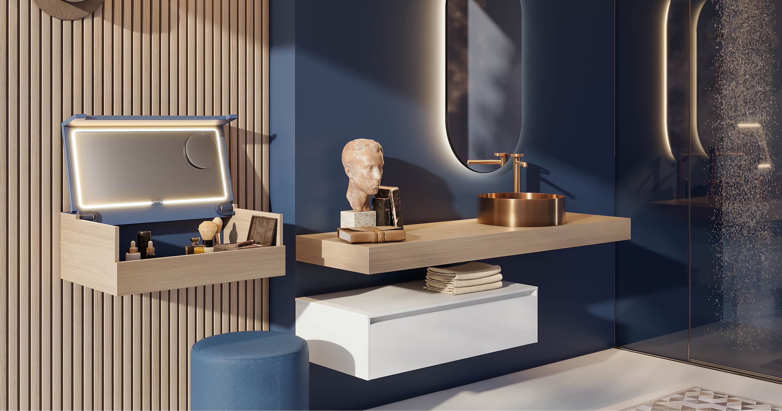 Il blu con il legno dona al bagno un senso di calore: inserisci dei dettagli con differenti tipologie di legno, per esempio il piano del mobile con venature in rilievo abbinato a un lavabo d’appoggio in ceramica blu e un mobiletto con dettagli blu lucidi.