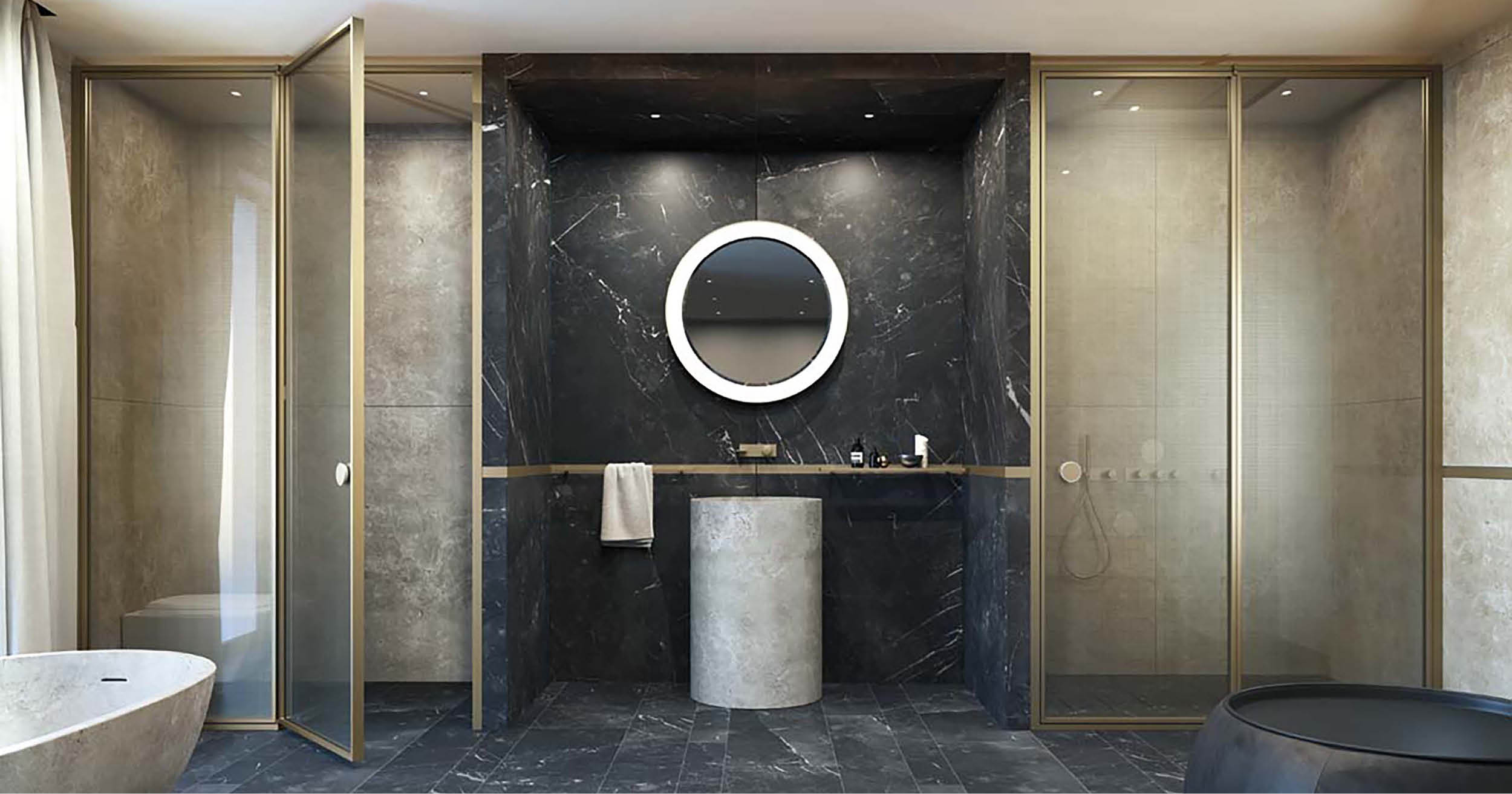 Se vuoi dare grinta al tuo bagno, inserisci dei dettagli metallici o in rame, non solo per la rubinetteria, ma anche nelle finiture del box doccia e degli accessori.